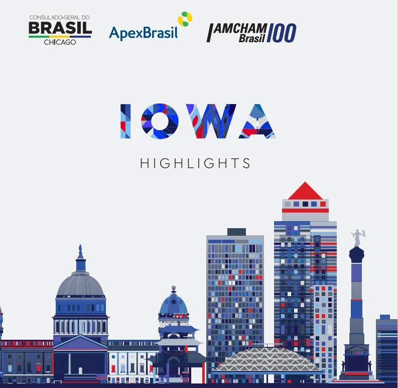 A publicação “Iowa Highlights – Radiografia dos estados do meio oeste dos EUA” tem o objetivo de oferecer às empresas e aos investidores brasileiros que tenham interesse na internacionalização de seus negócios um panorama multifacetado e com informações relevantes sobre o potencial da região. A publicação é resultado de uma parceria entre o Consulado Geral do Brasil em Chicago, a AMCHAM e a Apex-Brasil. No guia “Iowa Highlights”, são apresentados os principais dados sobre potencialidades econômicas e de infraestrutura do estado e um panorama da relação comercial entre Iowa e o Brasil, além de uma análise de oportunidades para subsetores de produtos brasileiros.